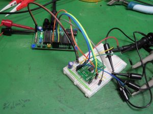 試しにパスコン増設やダンピング抵抗かましても変化なし。ブレッドボードで組んだからなのか、ジャンクから剥がした石だからなのか・・・検証するにもこれ1つしかないので困ったなと。